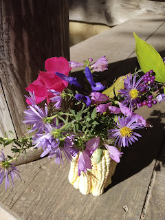 While out thrifting with a friend, we visited a new to me discount grocery. They had a lot of frozen foods, which I wasn't interested in, but I found kalamata olives for $1.99 and a 5# bag of grits to make bird suet with for $2.99. While thrifting, I found a lovely enamel pan to save egg shells in before composting for $3. My old one had rusted enough that it had holes in it. The Habitat store we visited had a nice bird section in it, with seed and bird houses, among other things. I found the bird alert decals I use on the kitchen windows and door for less than half price. Harvested last week, were eggplant, yellow squash, peppers, hickory nuts, black haw and hawthorne fruits, and figs. With no frosts in our forecast through the 7th, we're enjoying all the bonus flowers. Wishing you a week of seasonal pleasures.