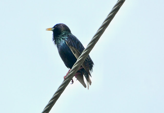 Many mornings Bruce and I practice pickleball together for as long as the heat and humidity will allow. I have never sweat so much in my life! Another morning I rode my bicycle out of the complex, something I rarely do because of the busy street we are on. As I was coming back, riding on Mills Ave. near Boone, I noticed a bird on a wire overhead. Surprise, surprise. This morning I took a look at the photograph and much to my delight, it appears to be a Starling, although I could very well be wrong. Anyway, what looked like just a dark bird turned out to be one full of jewel tones.