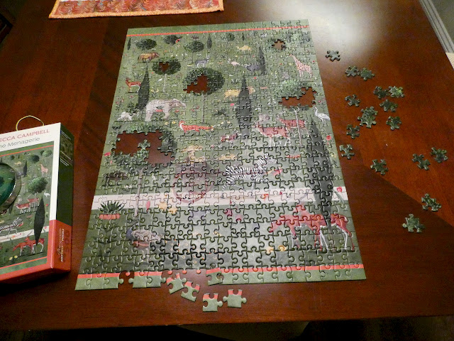 It turns out jigsaw puzzles are an excellent way to spend rainy afternoons, something I'm only now learning at my advanced age. Sue gave me the excellent tip about using a magnifying glass on the one I was working on, helping somewhat. What also helped was dragging Bruce into it because with his patience I was certain we could get it done. Except we did not. The trees just would not go together, probably because other green pieces were wrong, but I decided to throw in the towel. It's supposed to be fun right?