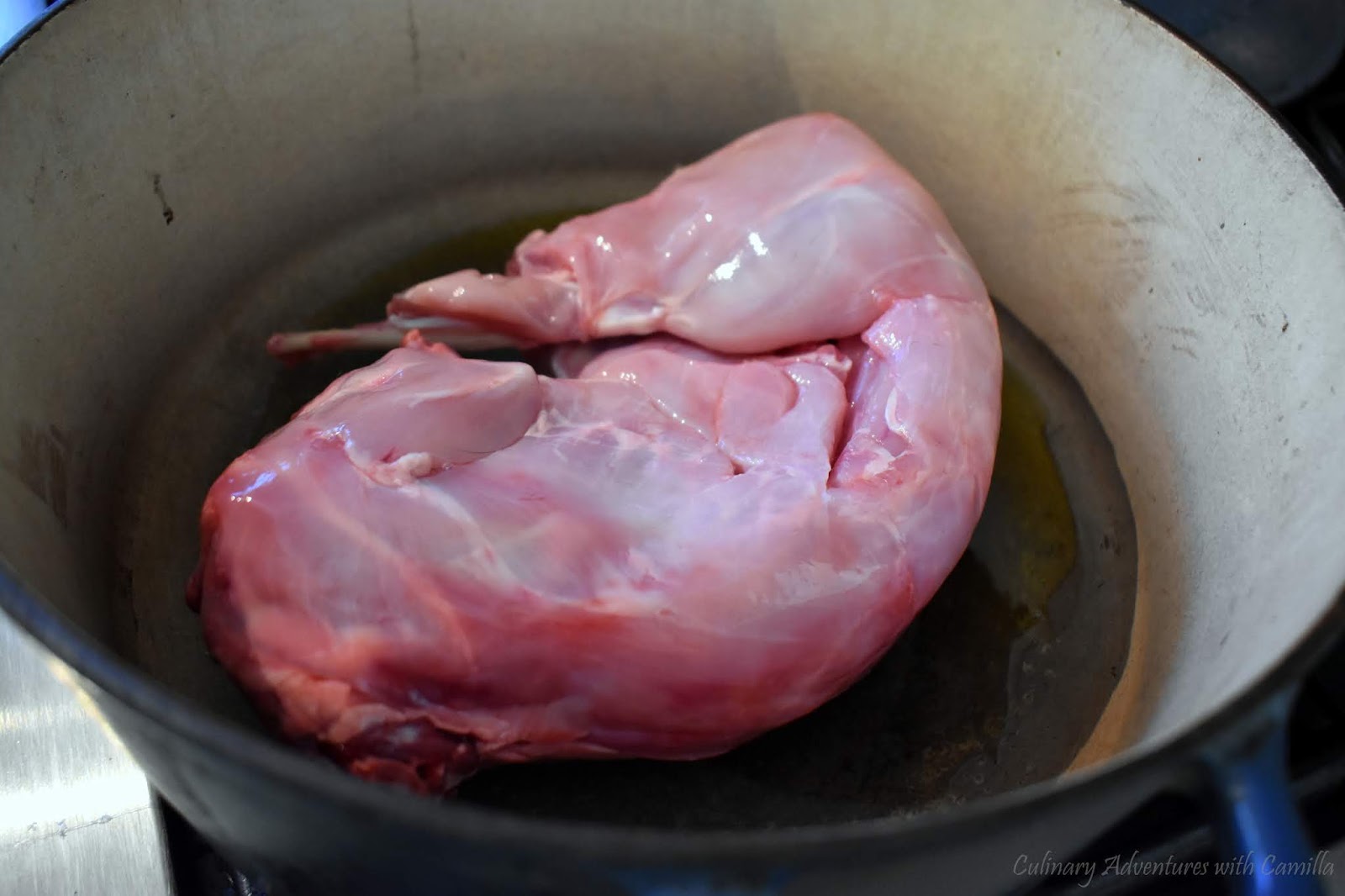 Brown the rabbit in a splash of olive oil in the bottom of a Dutch oven. Cook it for 2 minutes on each side to get a nice brown color. Add in the rest of the ingredients, making sure the rabbit is about halfway submerged in liquid. Bring it to a boil. Cover and reduce the heat to a simmer. Braise for 2 hours.