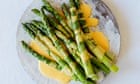 Asparagus and hollandaise to start, slow-roast duck legs with bacon and onions to follow, with sides of braised peas and lettuce and Jersey royals; and a rice pudding with cherry jam to finish