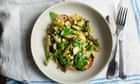 I come back from the market with a shopping bag that is entirely green. Bunches of mint and basil; the first peas and young broad beans from Italy; courgettes too. There are bunches of asparagus, lower in price now as the season comes to an end. Those gentle, early season flavours are worth celebrating – some of the asparagus will end up braised in olive oil and vermouth, to be eaten on toast soaked with the cooking juices. The courgettes will be grated and made into little cakes with parmesan and spring onion, and the peas will appear in a vivid green chutney to eat with crumbed and fried prawns.