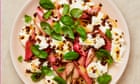 Grilled carrots and tofu in a salty-sour sauce; charred broccolini and asparagus on a butter-bean mash doused in pepper salsa; and griddled rhubarb with burrata, peppery oil and honeyed ginger