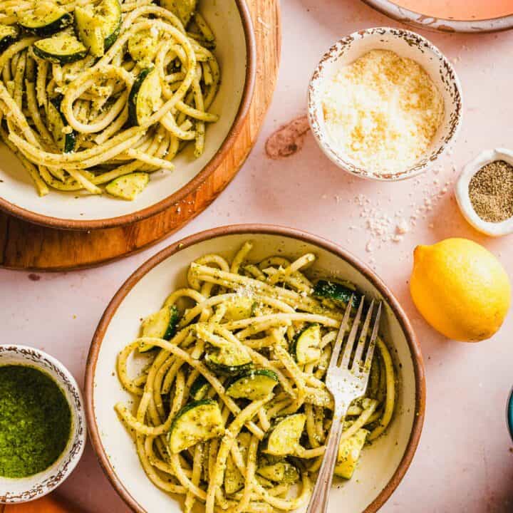 Zucchini all by itself is one of my favorite summertime veggies. It’s ripest during the summer months, so make sure you get your hands on a fresh one! Farmer’s markets are my favorite place to buy seasonal veggies, but the grocery store should also be fully stocked as well. You’re going to love the way this pasta dish highlights that signature zucchini flavor!