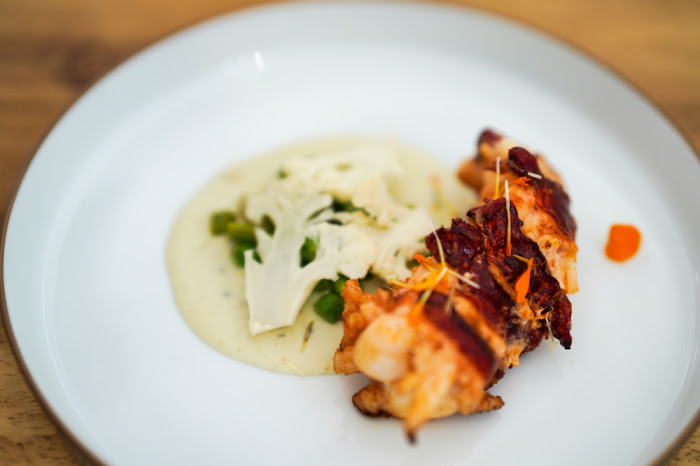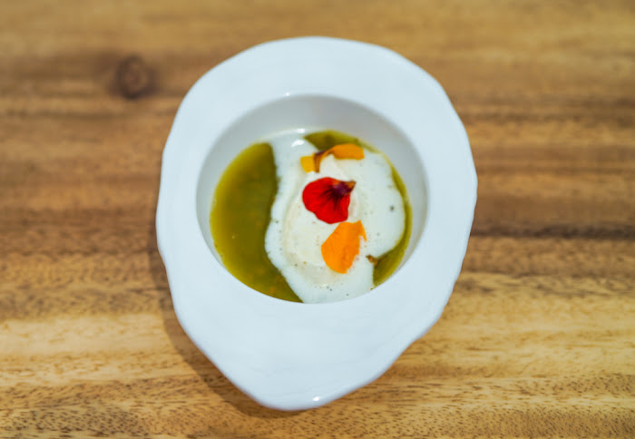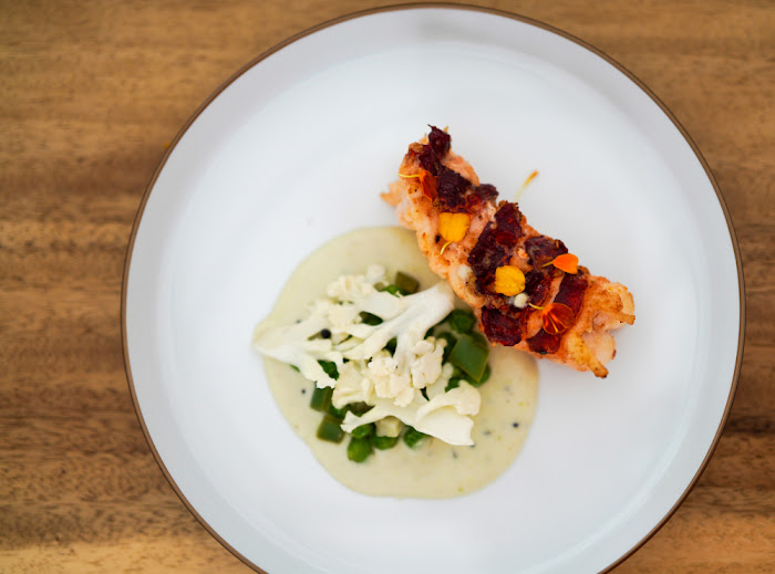 Two asparagus spears pay homage to Yogi's French culinary training, nodding to the classic Gallic preparation of asparagus with hollandaise sauce. This ensemble is a pleasing patchwork of colours - the green of the shoots, the orange of smoked hollandaise, the pristine red of Spanish pimentos, the mellow yellow of turmeric foam.