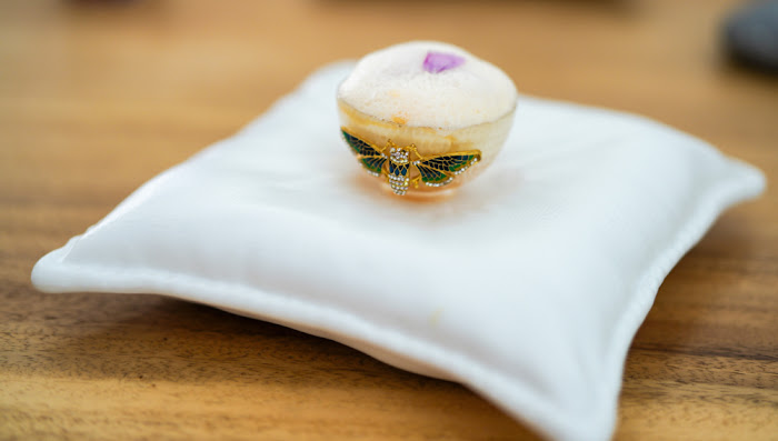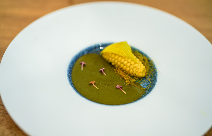 Finally, we wade into the Swamp - treading the path of sustainability, Yogi gives us an earful, an ear of corn in full, from kernel to husk and silk, but in an unexpected texture and temperature. The kitchen has roasted Japanese corn, poached and pureed it, put it in a mould and frozen it. The result is corn that needs no chewing, like baby food, stuffed with spiced jelly. Its coolness contrasts with a warm pudding of amaranth leaves, florally adorned to represent the ravishing lotus flowers that populate a swamp. The synergy is sweet earthiness with a marvellous mouthfeel.