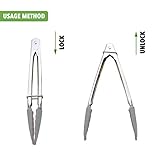 Ergonomic handle design and heat resistant the handle is cushioned with silicon good for thumb rest and ensures good grip and control The metal tong head is super heat resistant Easy to rinse dishwasher safe Pull ring lock and unlock and hanging loop this kitchen tongs set has locking mechanism pull the ring for lock and push for unlock super easy operation Hang them with the hanging loop after use or put in the drawer by pulling the ring to lock it space saving
