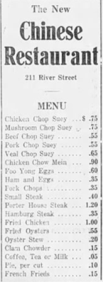The Bennington Evening Banner, January 15, 1929, had an ad for a new Chinese restaurant at 211 River Street. It presented its menu of American and Chinese dishes, including various Chop Suey dishes, Chicken Chow Mein, Foo Young Eggs, Pork Chops; Small Steak, Porterhouse, Hamburg Steak, and Fried Chicken.