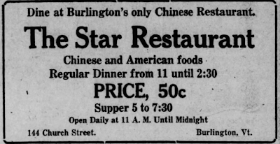 The Burlington Daily News, January 14, 1922, presented an ad for the transformed restaurant, noting it was "Burlington’s only Chinese restaurant." Located at 144 Church Street, the restaurant would be open from 11am-midnight. The restaurant would last for about 25 years, with only brief mentions in the newspapers, and not much of import.