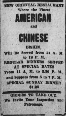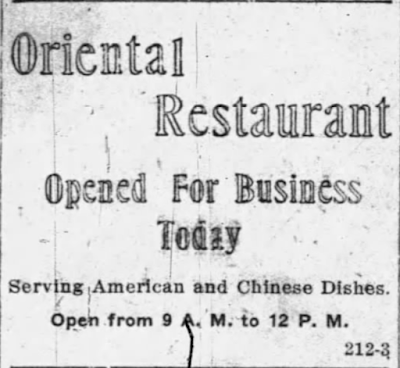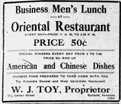 The Rutland Daily Herald, September 6, 1922, published an ad for the new Oriental Restaurant, which would be open from 9am to midnight, serving American and Chinese dishes.