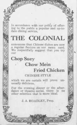 Another restaurant offering a few Chinese dishes on their menu. The Brattleboro Reformer, October 14, 1924, printed an ad for The Colonial, which “announces that Chinese dishes are now a regular feature on our menu card." The dishes included Chop Suey, Chow Mein, and Fried Chicken Chinese Style. The Brattleboro Reformer, October 31, 1924, had a larger ad for The Colonial;, which stated, “For the evening dinner we suggest a planked steak with all the fixings; or one of our Chinese dishes which we have recently added to our menu and which have become unusually popular.” Ads for this restaurant would continue through 1925.