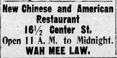 Some changes were made before the restaurant opened. The Rutland Daily Herald, August 6, 1917, mentioned that the restaurant would be known as Wah Mee Law, and open on August 11. Lee Dow was now referred to as Yee Den, and he was no longer the planned chef. Charley Gee, of San Francisco, was now the chef. Adding more information, the Rutland Daily Herald, August 13, 1917, mentioned that the restaurant, located at 16 1/2 Center Street, would be open from 11am-Midnight every day. The chef, Charles Gee, used to work at the Hong Kong restaurant in Boston, and the Oakland Hotel, Oakland, California. Both he and Yee Den were natives of California.