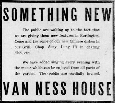 The Van Ness House, a new hotel, opened in October 25, 1870, and had a restaurant that would eventually serve some Chinese dishes. The Burlington Free Press, July 17, 1913, posted an advertisement for the Van Ness House, which noted, “Come and try some of our new Chinese dishes in our Grill. Chop Suey, Lung Hi in chafing dish, etc.” Who was cooking these dishes?