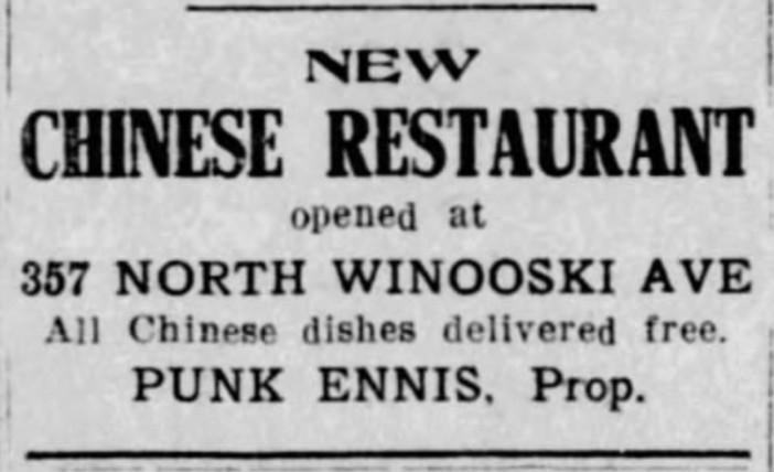 Probably the first Chinese restaurant in Vermont was established in 1909. The Burlington Daily News, November 16, 1909, presented an advertisement for a new Chinese restaurant that opened at 357 North Winooski Avenue. The proprietor was Punk Ennis, who was also known as Percy Ennis. It was interesting to note that the ad said, “All Chinese dishes delivered free.” Free delivery? That certainly sounds like an innovation for those times.