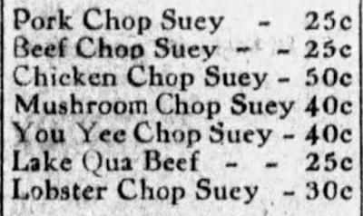 The menu above was included in the ad, with items from Pork Chop Suey (25 cents) to Lobster Chop Suey (30 cents). Lake Qua Beef was the only non-chop suey dish, although there wasn't a description of what it constituted. A couple weeks later, Gaw announced the restaurant would also open on Saturdays, which might have meant his business was doing well.