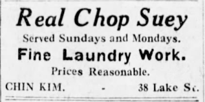 A month after the first Chinese restaurant opened in Burlington, Chinese food was also available in an unlikely spot. Around November 1907, Chin Kim, a Chinese laundryman in St. Albans, opened a new location at 38 Lake Street. Two years later, the St. Albans Daily Messenger, December 9, 1909, printed an ad for Chin’s laundry, noting that he now sold "Real Chop Suey" on Sundays and Mondays. So you could drop off your shirts and pants for cleaning, and pick up some Chop Suey to take home for dinner.