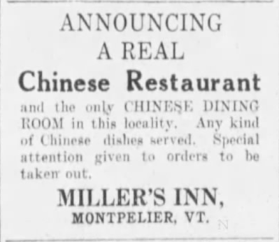 The Barre Daily Times December 15, 1926, printed ad for Miller’s Inn in Montpelier, which was the “only Chinese Dining room in this locality." The ad also stated, “Special attention given to orders to be taken out.” Take-out Chinese food seemed to be a popular idea in Vermont during this period.