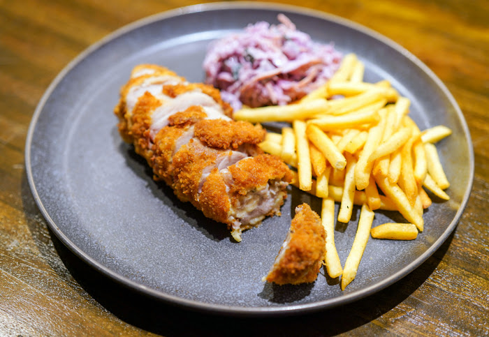 The sous vide chicken thigh roulade is served cordon bleu-style, rolled and layered with turkey ham and cheddar cheese, crisp to the breaded bite, smooth and tender to the chew, rounded out with a refreshing pickle slaw and fragrant truffle fries (RM35).